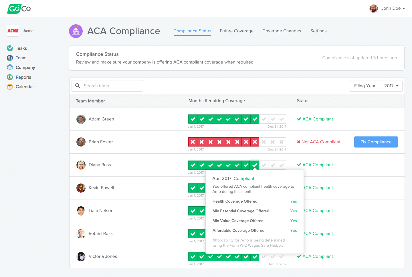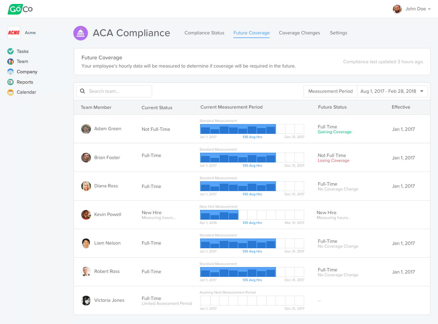 GoCo now makes it super easy to track ACA Compliance for your entire company! GoCo will do all of the heavy liftings in terms of calculating your ACA compliance, including: