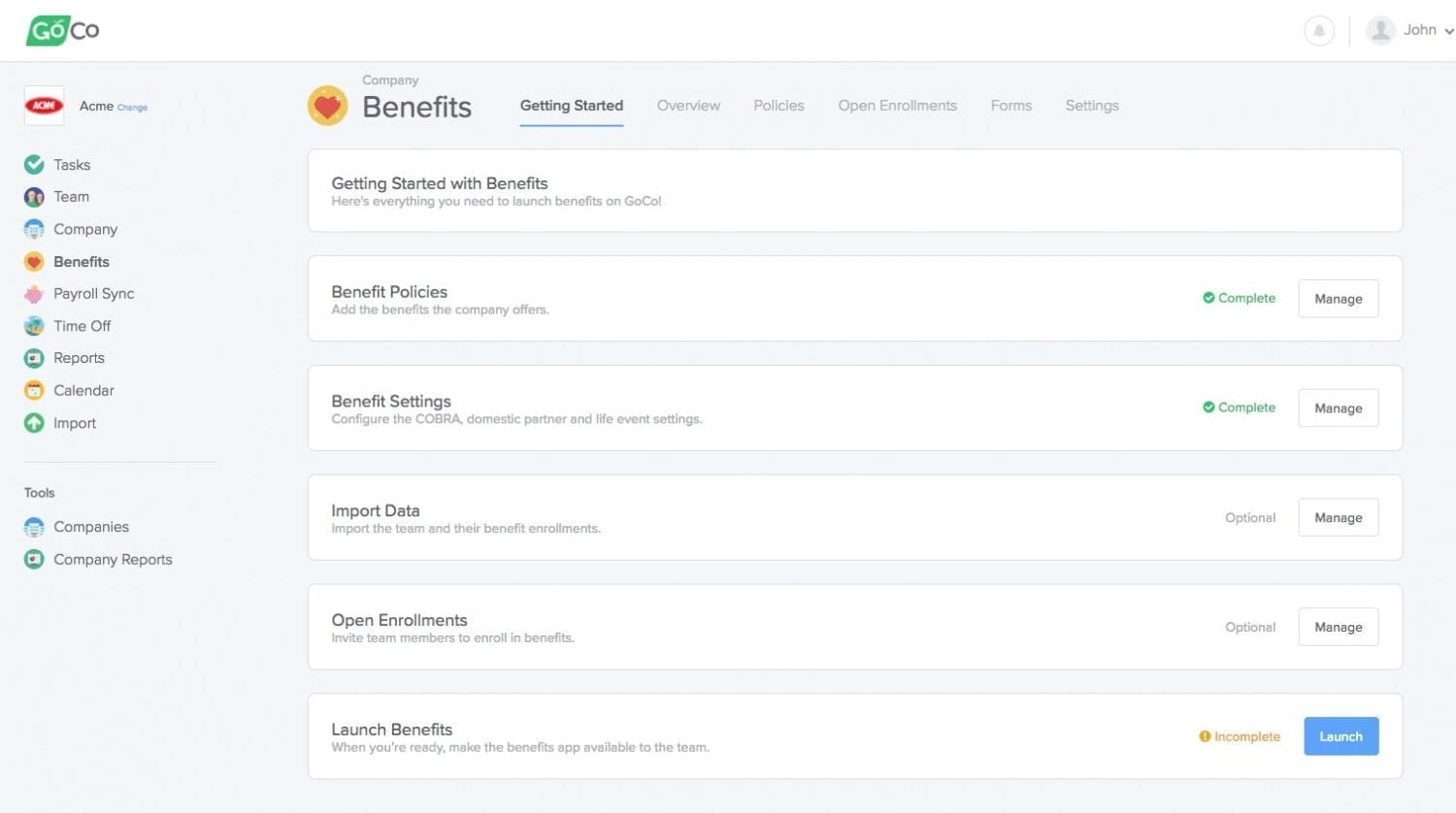 When setting up a new company, simply go to the Benefits app, and you'll land on the Getting Started page. All the sections that are required before launching benefits will have an Incomplete status. Complete everything and launch the benefits app when you're done!