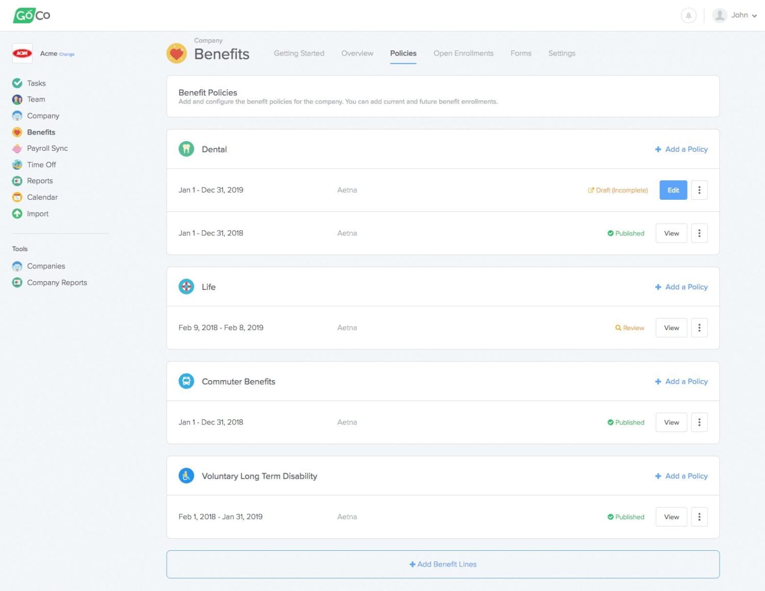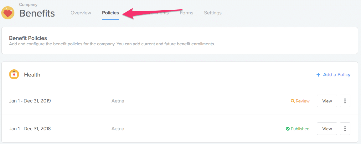 So instead of organizing benefits in Open Enrollment buckets, they're now organized under Policies. Think about Policies as just the types of benefit coverage the company offers (Health, Dental, Vision etc.).
