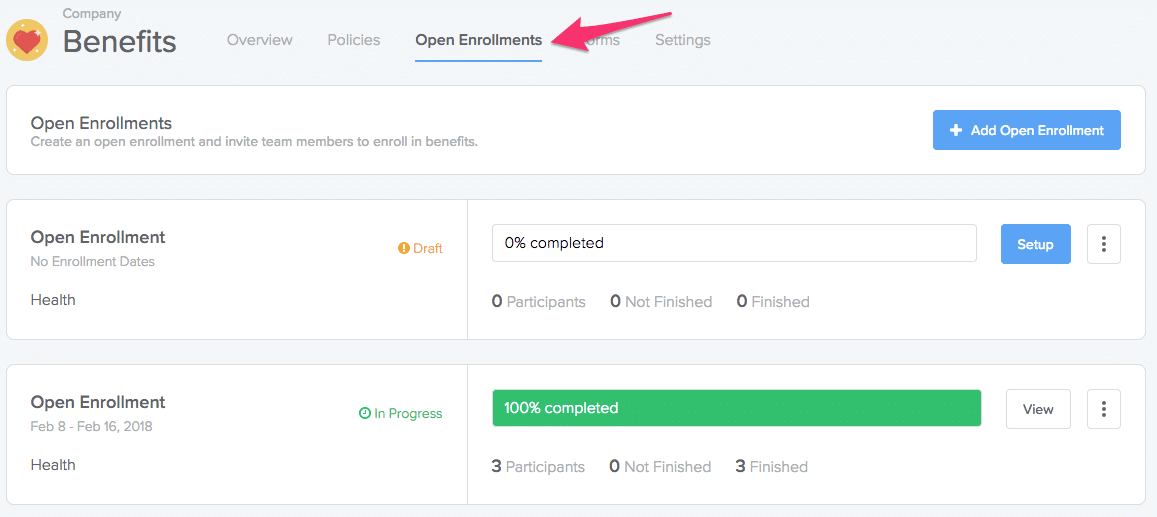Open Enrollments have been improved to give you and the company more flexibility. You simply add the published benefit policies to the open enrollment and then you'll be able to see all the team members that are eligible to participate.