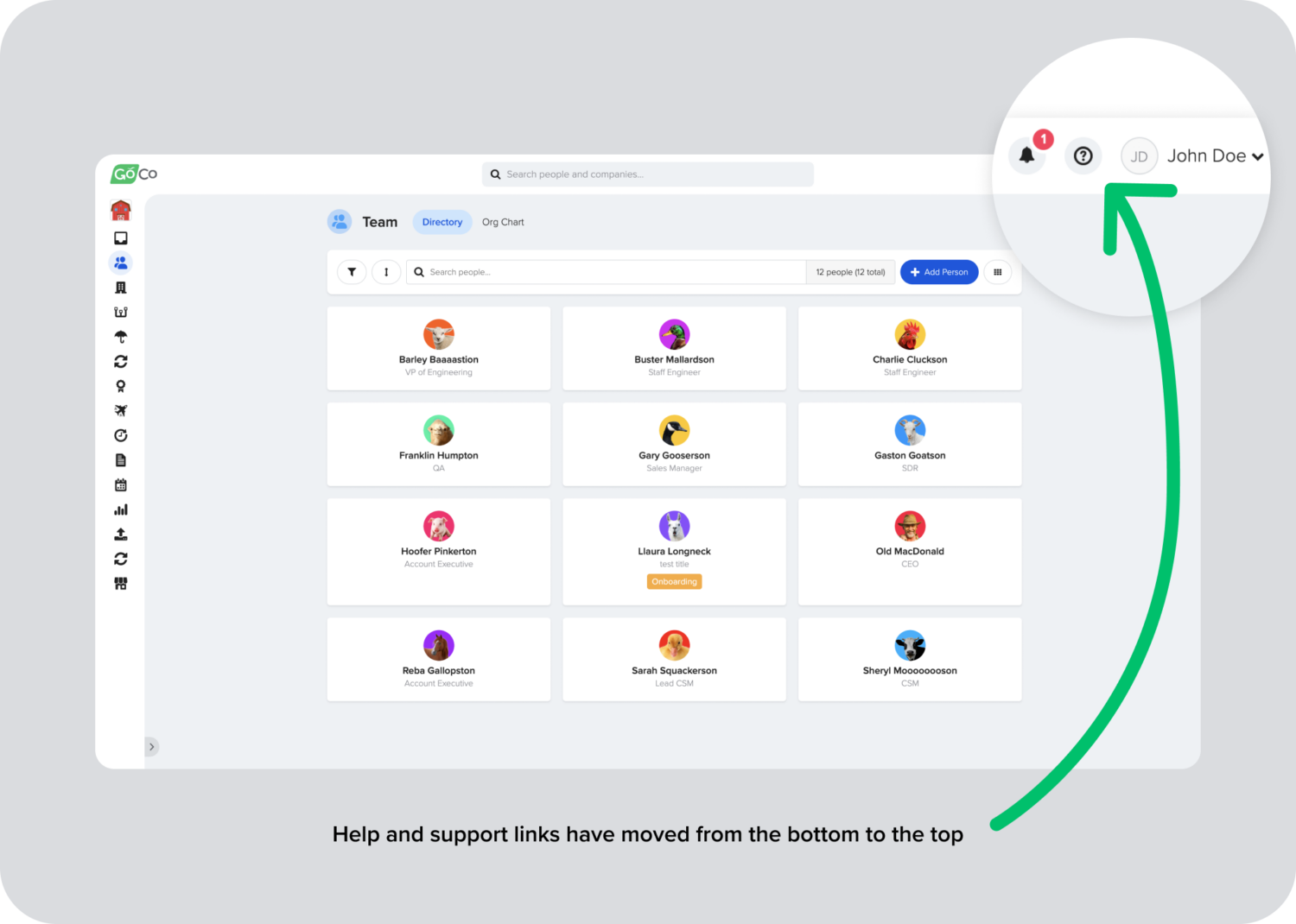 The last change we made was removing the footer area that used to sit at the bottom of GoCo. This footer used to take up precious space on the screen and block content. It also cluttered up the page a bit by adding content that most people didn’t use. So we made sure the most important links around help and support were moved up into the top right area of the app. Some of the most popular web apps like Slack, Gmail, Facebook, and YouTube do the same so we felt that it would be a familiar area to look for the help link.